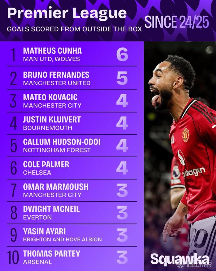 北京时间10月26日,权威数据机构Squawka发布了自上赛季以来英超联赛中禁区外进球数最多的球员统计。库尼亚以6粒进球位居榜首,B费以5粒进球紧随其后,科瓦契奇以4粒进球位列第三。
